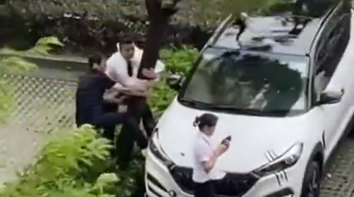 其实从现场的画面中能够感受得出来风的呼啸声,虽然说这两位壮汉的身材不像鲁智深那般可以倒拔垂杨柳,但也不是骨瘦如柴。只见两位壮汉,双手抱紧树干,然后用双脚抵住车身。这样既能保住自己的安全,还能暂时地不让树倒在车身上。