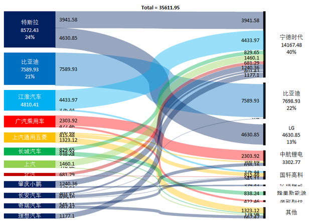 这个排名其实毫无悬念。主要是看一下供应关系,我这边做了一些供应信息的拆解。大部分当然是供给了蔚来和特斯拉,在供应新势力的方面,蔚来占据了一个很大的比例。由于供给合资企业的量没起来,新势力先起来了,这也证明之前宁德时代分散风险的策略是很正确的。另外,宁德时代还有一个厉害的地方:在图4中的“其他乘用车企业”直接采用了它给出了标准的方案,这部分也占据了很大的一块市场,大约在5.2GWh左右,份额在20%,比最大份额的蔚来还多。