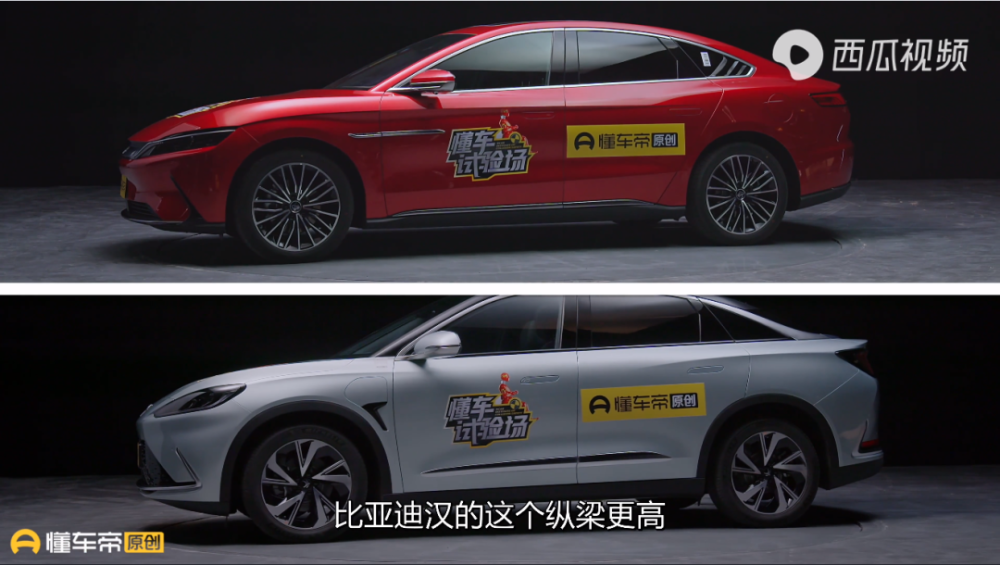 极狐阿尔法S在造型上有一种跨界的感觉,所以从外观上看好像底盘悬架更高一些,但是视频里特意提及了比亚迪汉EV的纵梁实际上更高一些,另外在整备完成后汉EV要重一些,前舱的缓冲空间也比较大。总之就是比亚迪汉EV各方面都占优势,这叫什么?这就是标准的捧杀。