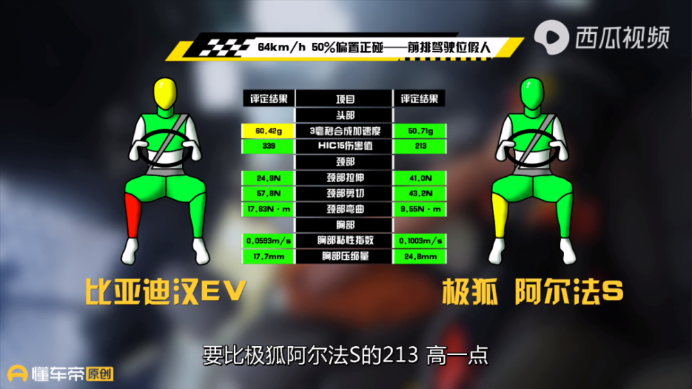 从假人的伤害数值来看,汉EV的成绩要差一点,但是考虑到时速,这样的成绩并不能算差。