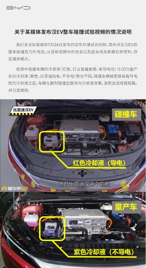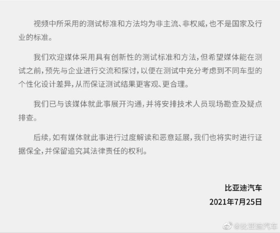 在一天以后,比亚迪官方作出了回应,质疑懂车帝碰撞试验的专业性以及车辆是否量产车。原图太长,截取重要部分,有兴趣的可以去官博看一下。