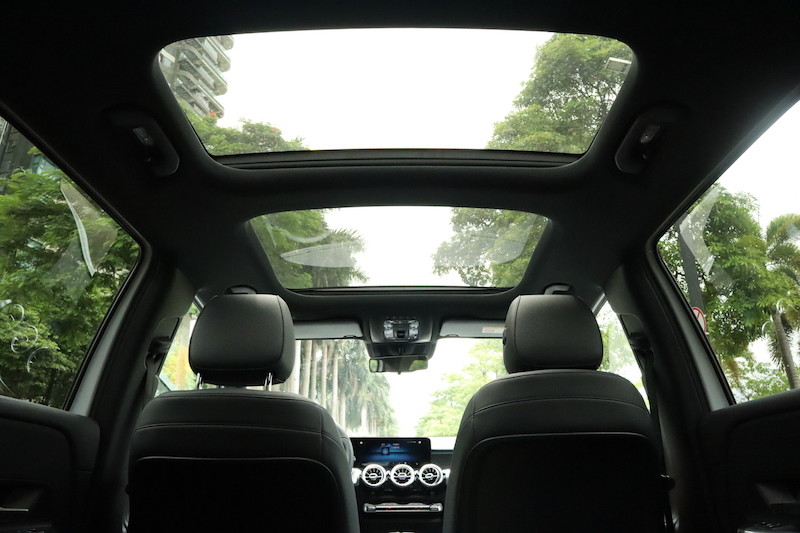 虽然尺寸不占优,但在刚进入GLB的后排,并非想象那般“拥挤”,反倒是感觉空间很大,经过一番研究之下,这得归功于其营造出的开扬感。GLB营造的开扬感主要体现在采光充足,主要是这几方面做得很好:车顶高度充足、双天窗设计、车窗的设计也是很大、C柱很小,加上座椅的坐姿高度足够,乘员能接收到更多窗外的景物。