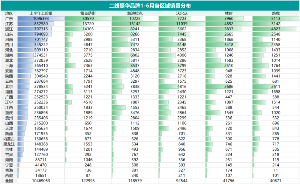 首先最大单一市场是广东,这点就和BBA以及其它二线豪华品牌不同,而和雷克萨斯、凯迪拉克、沃尔沃和林肯都相反的是,路虎在浙江的销量非常突出,远远超过其在江苏省的势力。