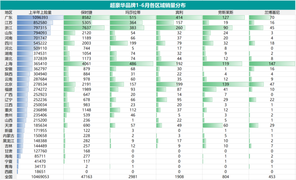 首先可以看出,超豪华品牌的区域分布,明显比一、二线普通豪华品牌更加集中,各区域的人口、GDP总量以及整体市场规模,在超豪华品牌中基本已经看不出任何影响,各品牌在上海、北京甚至天津一市的上险量,就能抵得上数个、甚至十数个省份的总和。