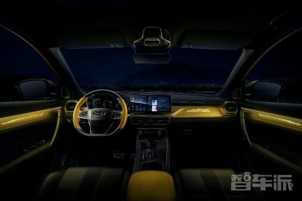 新款吉利缤越的内饰与外观的撞色设计相统一,座椅加入了Alcantara材质,包裹着大量软性材质;配备悬浮式12.3英寸高清触控大屏,充满科技感;拥有72色律动氛围灯,更有呼吸模式、随驾驶模式联动、随车速律动、音乐律动等多种光效。