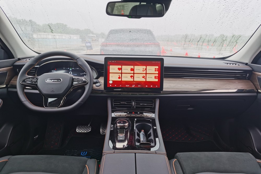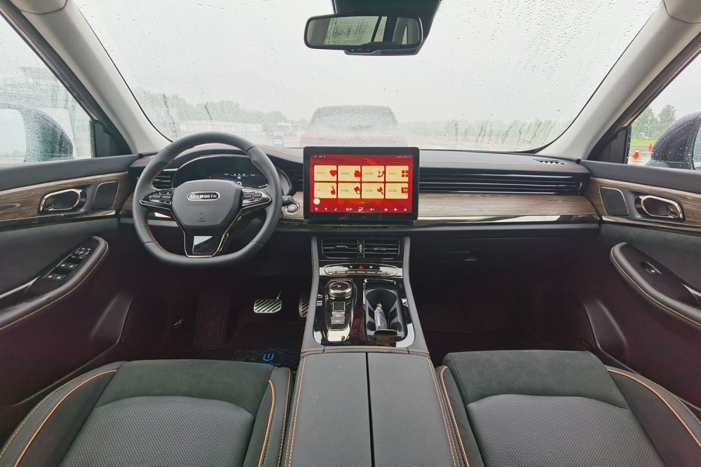 和众多的新能源车型不同,中控的设计并没有强烈的科技感,更像是一台稳重的燃油车。触手可及的地方都采用了“软包”材质,同时搭配上木质纹理饰板,走的是稳重大气的风格。