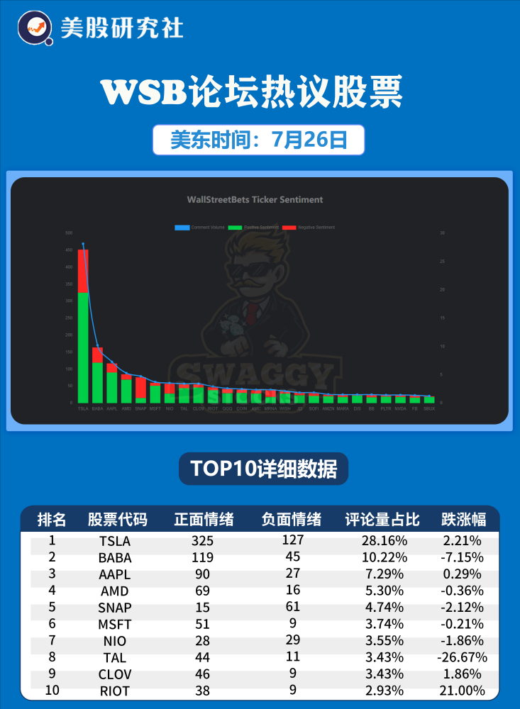 美东时间7月26日,WSB论坛热议股票top10分别是: