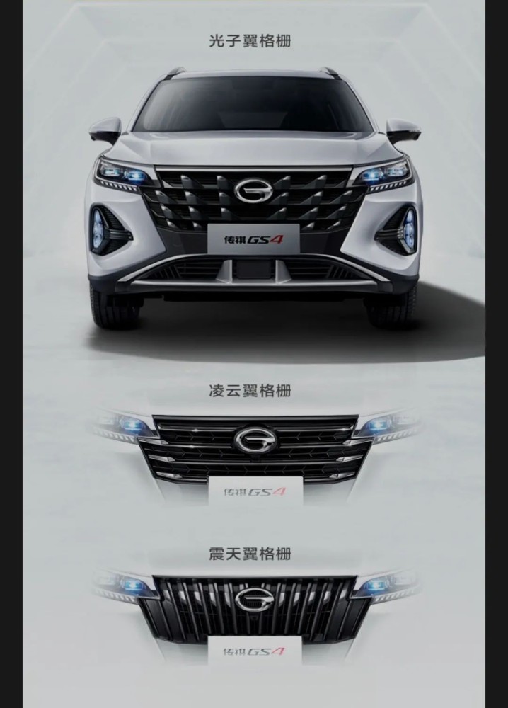 一辆车造型的好与坏直接影响用户是否深入了解的冲动,用简单的语言概括就是第一印象。GS4这次非常有心,提供了三种前进气格栅选择,包括光子翼、凌云翼以及震天翼,最大程度适应不同消费者的审美需求。此外,前包围加入三段式镀铬装饰,突显出整车精致感效果。侧面造型变化不大,上下两段腰线可以勾勒出不错的视觉层次感,熏黑涂装的D柱营造出悬浮式车顶效果。车尾换装了贯穿式尾灯设计,进一步拉伸横向视觉宽度。