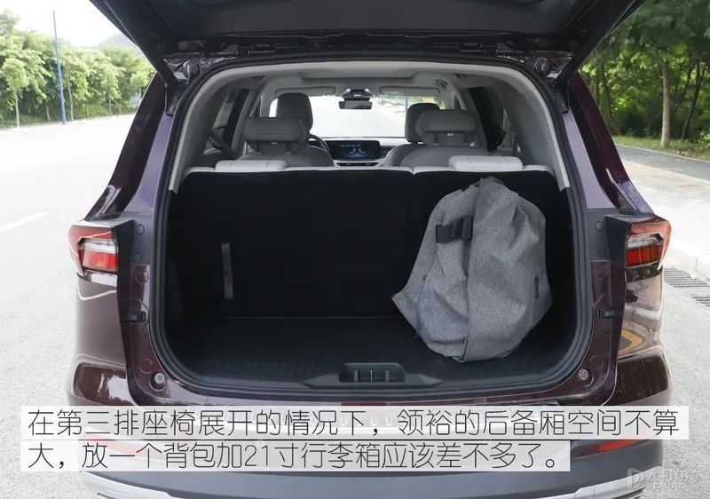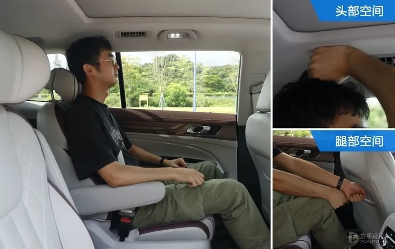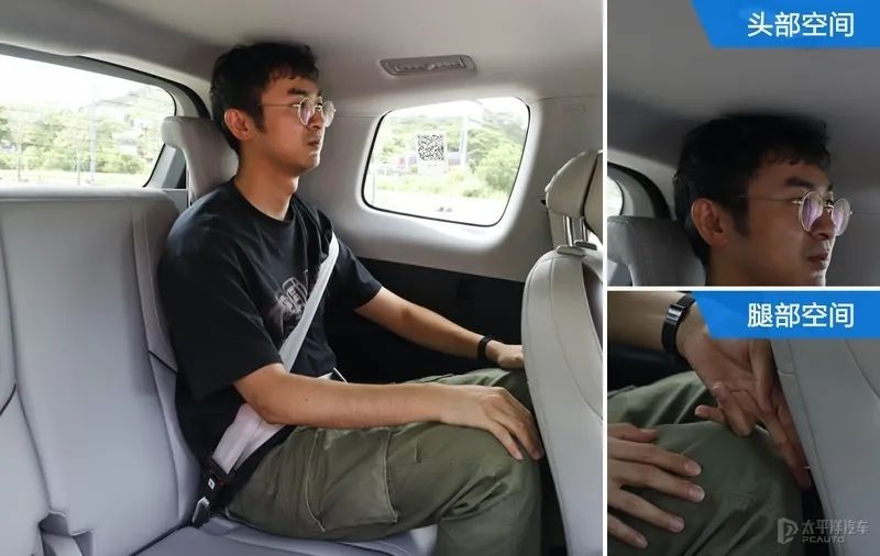 从实际的乘坐空间来看,第一排空间表现不错;第二排空间显得灵活;到了第三排要第二排往前挪才有腿部空间,头部已经顶头了,但短途应付一下还是行的。