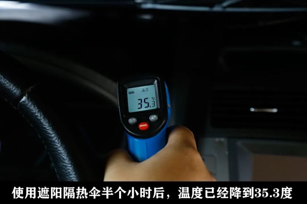 使用这样隔热伞后的车内温度,相比没使用前