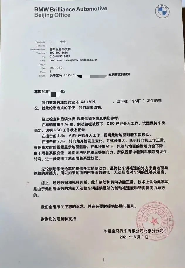 “地面湿滑制动距离变长我可以理解,但不至于踩刹车没有任何反应。" 因此,蒋先生认为宝马 iX3 存在刹车失灵的故障。
