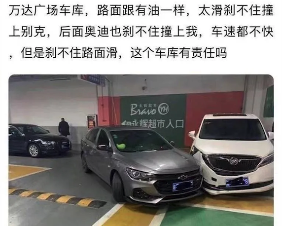 不过这类环氧地坪的停车场由于施工工艺上的差异,部分在遇水后相当湿滑,也就是是所谓的低附着力路面,不光是新能源汽车,大多数燃油车在这类停车场都有失手的经历,网上随便一找就是一大堆。所以地面在此次的事故中肯定扮演了重要的角色。