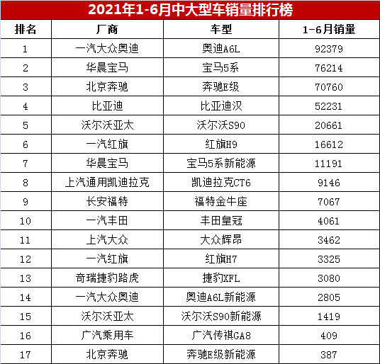 【2021年1-6月轿车销量排行榜 上半年中大型车销量排名】今年中大型轿车市场销量火爆,据购车网编辑日前整理统计显示,2021年1-6月中大型车累计批发销量达到37.52万辆,同比增长46.9%,销量比去年同期增加了11.98万辆。