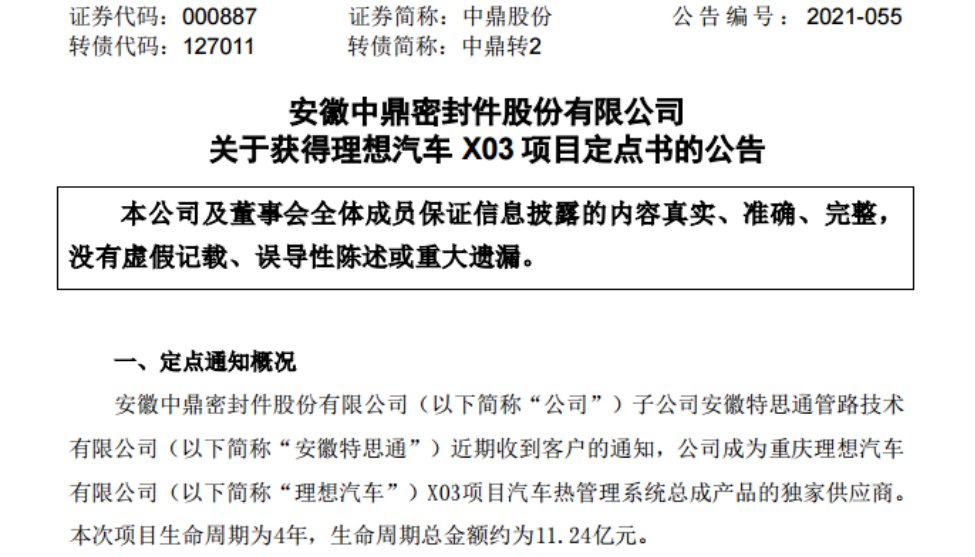 集微网消息,7月28日晚间,中鼎股份公告称,子公司安徽特思通成为理想汽车X03项目汽车热管理系统总成产品的独家供应商。此次项目生命周期为4年,生命周期总金额约11.24亿元。
