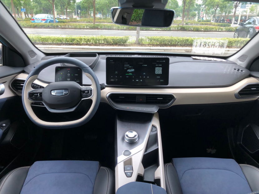 坐进车内,第一感觉就是方向盘很小,这就使得驾驶起来之后的操纵感变得更加灵敏。中控 12.3 英寸的大屏是目前新能源汽车的传统技能了,但是几何却将原本方向盘前面的仪表盘设计的特别小,就像放了块 iPad mini,不过麻雀虽小五脏俱全,显示的内容应有尽有,虽紧凑但不凌乱。