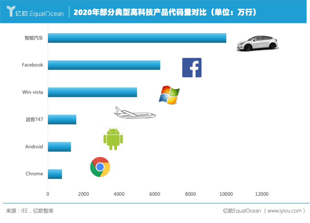 从软件代码量来看,常见智能手机操作系统安卓的代码量为1300万行,PC操作系统Windows Vista为5000万行,而高端车辆软件代码目前已经达到1亿行,且呈指数级增长。据亿欧智库预测,2021-2025年汽车中代码量年均复合增速可达21%。