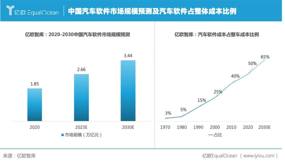 传统汽车产业正围绕着“软件定义汽车(Software Defined Vehicles,SDV)”,掀起了转型升级的热潮。亿欧智库预计,中国汽车软件市场规模将从2020年的1.85万亿元增长至2030年的3.44万亿元,年复合增长率达7%。汽车软件在整车价值中所占的比例有望在2030年达到65%,成为未来汽车产业中的重要利润点。