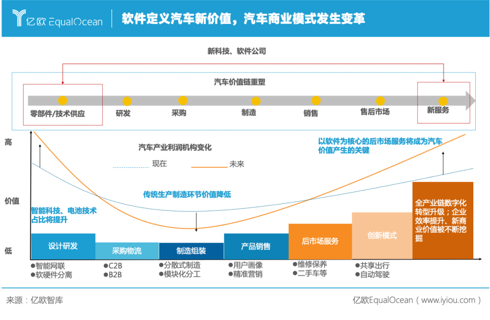 亿欧智库认为,软件正在重塑汽车产业的生态价值,改变车企的盈利模式,硬件端和制造端的利润将维持合理且较低的水平,未来软件利润和服务收入将成为新时代的估值锚准,车企盈利模式或将以软件和服务为主。