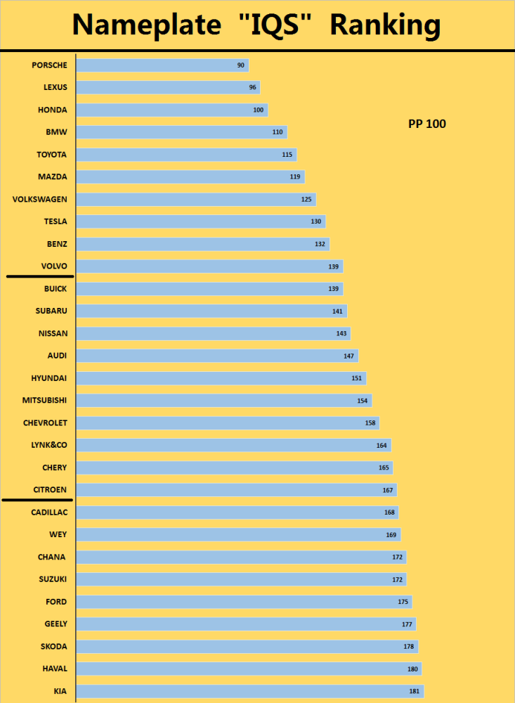 3、另外,别克汽车、斯巴鲁、日产和奥迪汽车的PP100都在150以内,整体质量表现还是比较不错的,不过别克汽车能够反超日产和奥迪汽车,还是比较有争议的。现代、三菱、雪佛兰和雪铁龙都排名前二十,它们算是二线合资车品牌,整体实力还是比较不错的。凯迪拉克、铃木、福特、斯柯达和起亚汽车也都是榜上有名,不过它们的质量表现相对一般。
