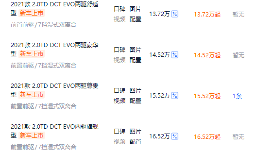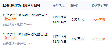 分为2.0T高低概率的调教版本,即便低功率也有218匹,325牛米,匹配7挡湿式双离合变速箱;然后高功率是238匹,350牛米,匹配8挡手自一体变速箱。一共5款车型。我也清楚大家肯定都希望买高功率的四驱车型。首先动力提升不说,双离合变速箱也变为8AT,多了四驱系统,而且里面配置还多了一大堆。