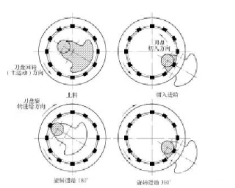 在大余量重切削情况下,一般采用内铣加工曲轴轴颈。加工总是从曲轴一侧加工到另一侧,先在靠近夹盘最近的主轴颈铣出中心架支撑的基准后,再依次加工主轴颈和连杆颈。当同时加工曲轴的主轴颈和连杆颈时,两个刀盘的旋转方向是相反的,以达到受力平衡,有效地保证了加工精度(这一点也是外铣做不到的),两个刀盘同时加工通过程序控制来保证动作同步,如图7所示。