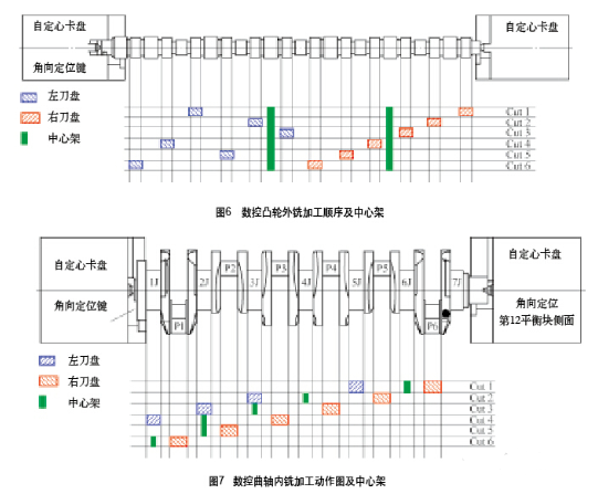 (3)数控铣的加工工艺。一般采用数控外铣进行凸轮加工,上料后通过头架的定位键(销)进行角向定位,然后从一侧顺序加工进、排气凸轮,加工时中心架跟踪支撑在相邻主轴颈上,以免发生大的弯曲变形。外铣在凸轮加工时,两个刀盘都向一个方向旋转,并根据凸轮轮廓型线实时进给,以保证形状精度。如图6所示。