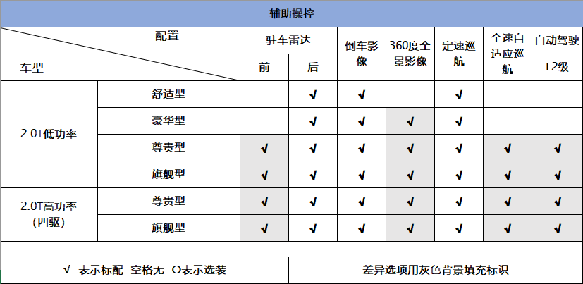 最后再来说说辅助操控配置,舒适型只给到了全系标配的后驻车雷达、倒车影像、以及定速巡航功能。豪华型在此基础上,多出了一个360度全景影像功能。尊贵型与旗舰型,所有辅助操控配置一应俱全。