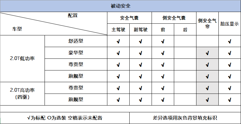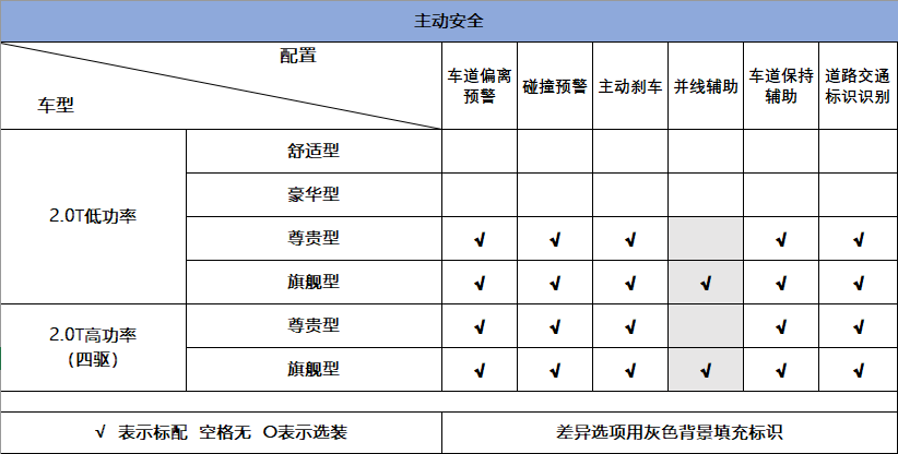 主动安全配置板块,舒适型与豪华型,只给到了一些基本的ESP、EBA等初级安全配置。尊贵型则配备了车道偏离预警、碰撞预警、主动刹车、车道保持辅助,以及道路交通标识识别,一共五项配置。旗舰型在此之上,还多出了一项并线辅助功能。