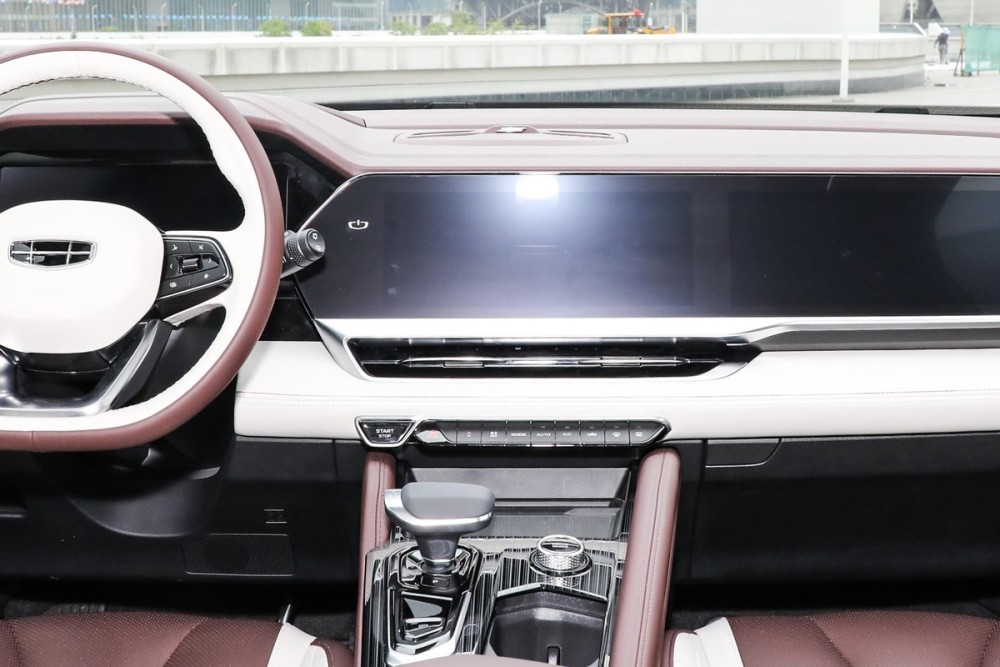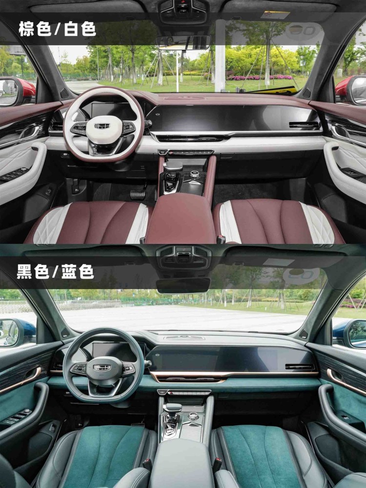 星越L在内饰上提供了棕/白,和灰/蓝两种配色。其实星越L在宣发初期流露出来的内饰渲染图,此前就被各家媒体和网友拿出来探讨过。当笔者看见实车的时候,还是有些小小的激动。当目前车市中的主流燃油车,还在以双联屏作为宣传噱头的时候,星越L已经玩上了三联大屏。此外,用料部分也是星越L的一大亮点,大面积的翻毛皮面料,以及皮革缝线和软性材质覆盖。对于豪华感和高级感的塑造,刻画得十分到位。