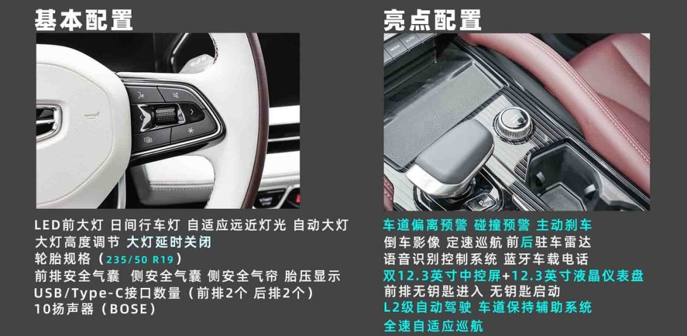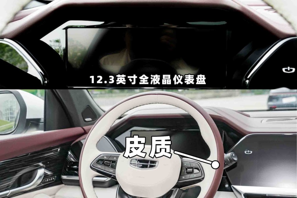 星越L在内部配置上,全系车型均使用皮质材料包裹的方向盘。方向盘的上下+前后调节,多功能控制,均为全系标配。最后,舒适型与豪华型,采用了一块10.25英寸的全液晶仪表盘,尊贵型和旗舰型则为12.3英寸。