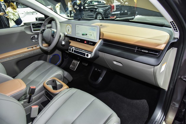 内饰设计方面,IONIQ 5贯彻了生活空间主题,配备了12英寸全触摸中控屏和12英寸数字仪表,双联屏也是时下流行风格,并可进行功能定制,中央扶手箱可以滑动至后排,前排主驾与副驾中间将毫无障碍。