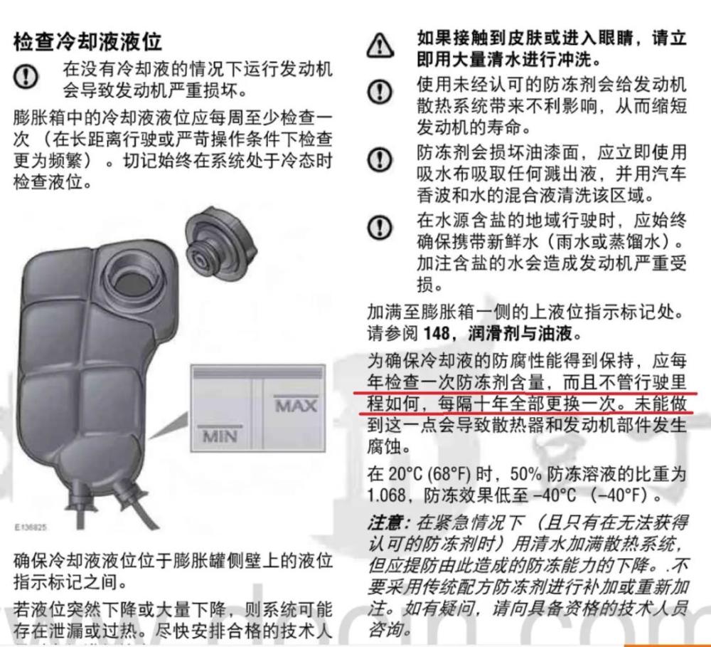一般情况下,车内的冷却液并不需要频繁更换,像我这台车的手册上就写着更换周期为“十年”,而十年内只需要添加同型号的防冻液即可。如今的市面上已经有了可以混合添加的防冻液,无论颜色和型号都能随意混合,我已经自己尝试过了,不会对车有任何影响。