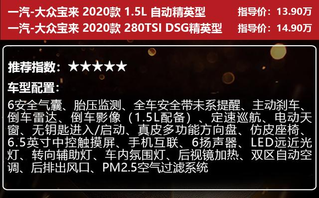 根据动力形式的不同,小智首推大家选择一汽-大众宝来2020款 1.5L自动精英型/280TSI DSG精英型。这两款车型在配置方面相当丰富,倒车雷达、定速巡航、无钥匙进入/启动、仿皮座椅、6.5英寸中控触摸屏、LED远近光灯、车内氛围灯、双区自动空调等配置一应俱全,能够满足大多数人的使用需求。至于选择1.5L还是1.4T车型,还要看你对于动力的实际需求。