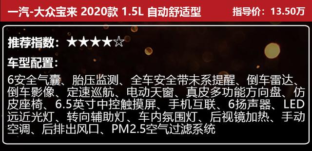 其次小智推荐大家选择指导价13.50万元的一汽-大众宝来2020款1.5L自动舒适型,相比价格高出4000元的1.5L自动精英型,这款车少了主动刹车、无钥匙进入/启动、双区自动空调等配置。如果你觉得这些配置不太重要,那么省下4000元也是一件很划算的事情。