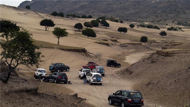 十月的翁牛特,沙漠里的温度超过40℃。第二天出发不到一小时,有辆小切因为发动机温度过高彻底歇菜,留下一辆车陪它等救援,最后只剩10辆车进沙漠。这里面,除了途锐是suv外其余全是越野车,包括三辆丰田4700,两辆丰田霸道4.0,两辆切诺基4.0,一辆牧马人4.0,一辆途乐Y61 4800。