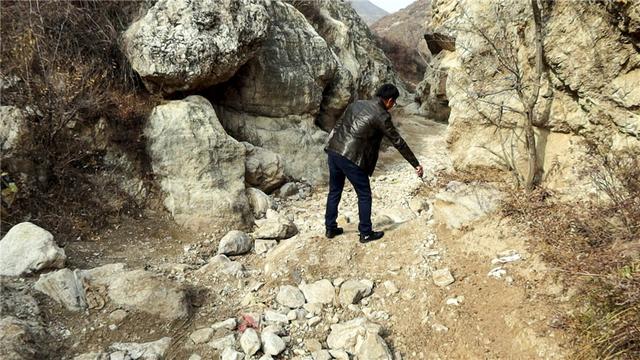 前面就到了最关键的地方,右前方一块巨石正虎视眈眈地等着我们“碰壁”。油门不能给大了,不然车会向前蹿,在这么狭窄的地方你又没法调整方向,很可能差一丢丢车的前杠或屁股就会碰到两边的山体。在这种路况下,必须慢慢地给油,让车辆均匀地,以很稳的速度,一气呵成地从乱石头上驶过,切忌一走一停,一走一停。