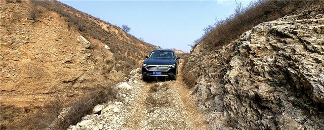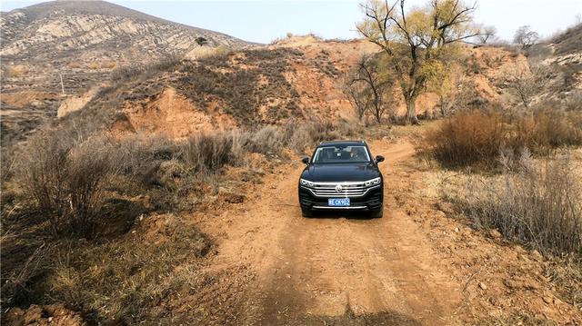 最先经过的是一段盘山碎石路,路面上有很多小石头,部分路段有清晰的车辙印,坐在车里能明显感觉到车辆的空气悬挂变硬,车身抬高,呈现出和公路驾驶时完全不一样的状态,毕竟我们用的不是越野胎,附着力差很多,有一定颠簸晃动很正常,这种路况途锐完全可以轻松应对。
