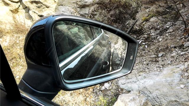 从后视镜看,右车身与旁边岩壁最贴近处只有2个手指的宽度。我把途锐开到前面稍平坦的地方下车检查,发现左前方保险杠的下面稍微蹭了一点,看来这种程度的越野还是有些难为用公路胎的途锐了,幸好其它地方没出什么问题。