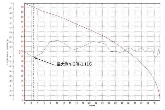 一汽-大众速腾1.2T臻享版 100-0km/h的刹车距离为:42.64m, 最大刹车G值为:-1.11G。