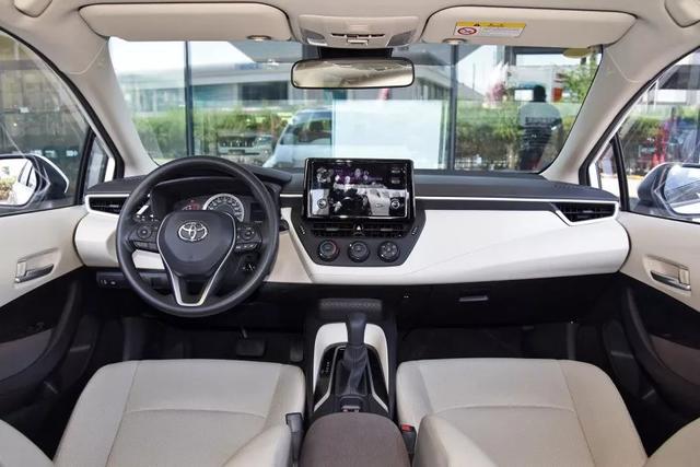 全新卡罗拉内饰设计简洁,中控台的直线条延展了视觉宽度。这款入门车型虽配备有多功能方向盘,但是并没有配备中控大屏,而且空调控制系统由三个旋钮组成,视觉效果不如次低配及以上车型。