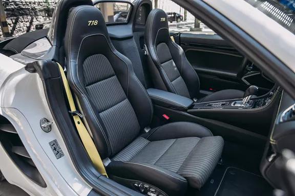 打开无框车门,冰冷的内饰虽然有些过于简单,但该有的功能都有配备。一旦你坐进车内以后,它所表现出的那种运动氛围就很强了,你所需要做的就是手握方向盘,盯住前方道路,认真驾驶。而对于保时捷旗下的车型而言,想要满足更高级的配色以及配置,肯定需要选装。竞技黄Sport-Tex的内饰:拉带式的门把手,大量的黄色缝线,也为冰冷的内饰带来了一丝活跃的气息。