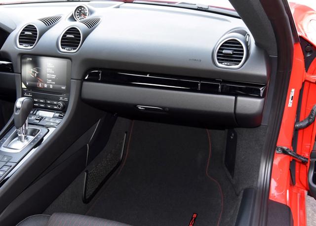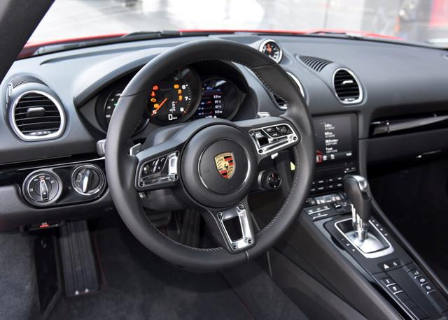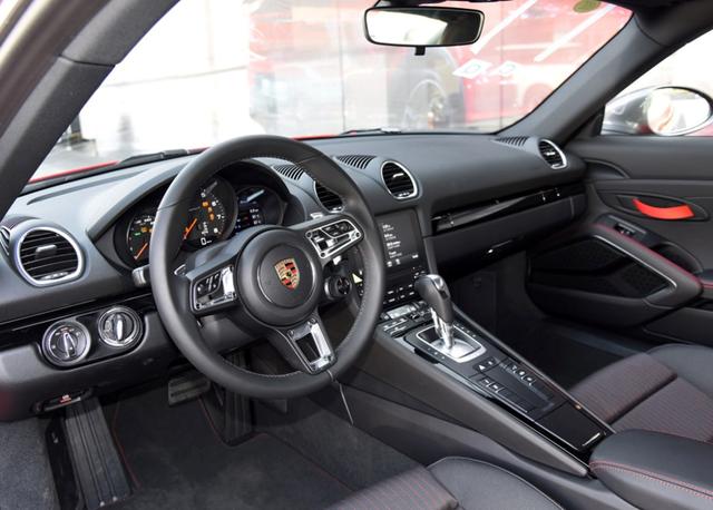 内饰,新车有着保时捷浓厚的风格,依旧继承了718车系,并且把轻量化表现到了极致,新车取消了保时捷中控的通讯系统,如果喜欢也可以给你免费装上,如果喜欢纯粹的运动,那么就选择简洁的设计,门把手也以织物材质取代,方向盘换装为GT运动方向盘,仅为纯粹的方向盘,上方没有任何操控键,主要为了减轻整个车身重量,让驾驶员注意力回归到驾驶上,享受纯粹的乐趣。