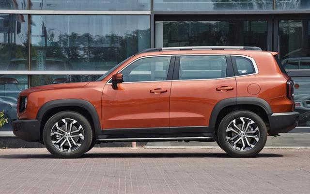 侧面是独特的设计,看着很方正,没有一丝拖沓的感觉,十分规整。再往下看是宽厚的黑色轮眉和19英寸轮圈,看着气场不错,很有硬派越野气息。