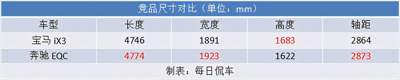 车身尺寸长宽高为4746/1891/1683mm,轴距为2864mm,与燃油版相比,长度增加了29mm,高度降低了6mm,其余保持一致。相比奔驰EQC,其实两者的轴距仅有9mm的差异,但因为iX3多少要考虑操控性,因此长度做得很收敛。