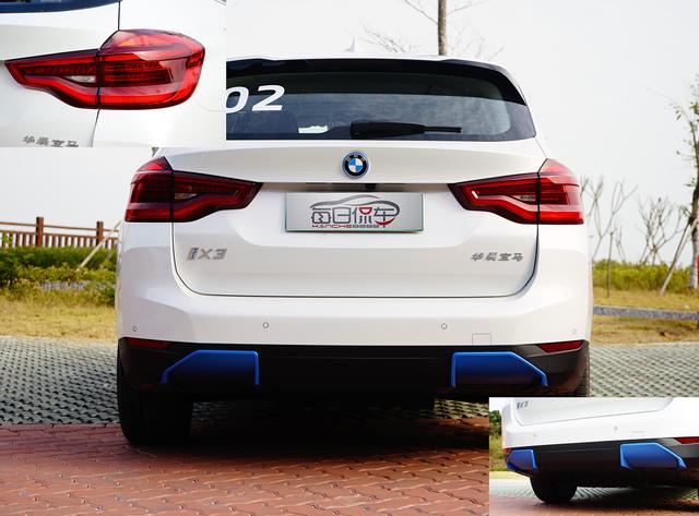 尾部造型同样延续了燃油版车型,尾灯也没有改变,看起来非常熟悉。主要差异来自保险杠底裙部分,iX3取消了排气管,取而代之的是双边蓝色扩散器护板,只不过这样的装饰看起来有些突兀,不是很自然,如果把扩散器改为银色效果可能会更好。