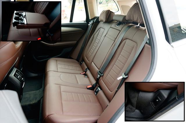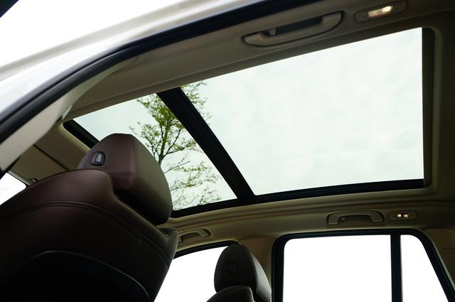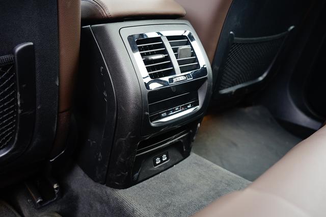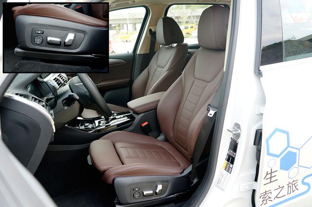 前排座椅采用棕色真皮包裹(入门车型为仿皮),皮面偏硬,坐垫和靠背填充物也较为硬朗,能提供充分的支撑力和良好的侧向支撑,座椅与身体的贴合度很高,人体工程学相当成熟。功能上,主副驾驶座椅均支持前后、靠背、腿托、高低(4向)和腰部(4向)电动调节,并且带有加热功能和记忆功能(驾驶位)。