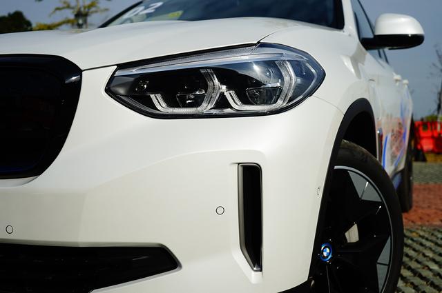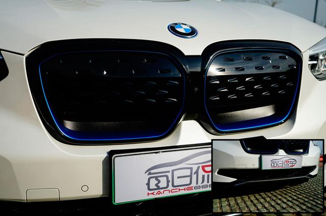 经典双肾格栅变成了封闭式,通过丰富的点阵纹路增强设计感,边缘处较细的蓝色边框只有在近处才能看得清楚,离得远点其实一点都不明显。我们注意到,前脸并不是全封闭式,下半部分其实是开口的,内部带有主动闭合式格栅,能够对热管理做出主动的调整。与燃油车较大的下格栅不同,电动车的下格栅做得比较细长,底部还增加小风铲结构。