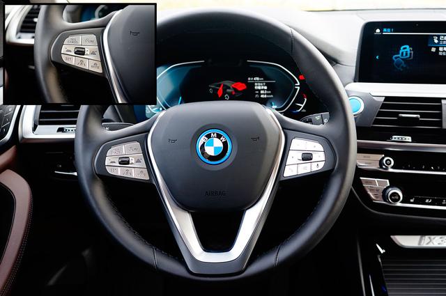 真皮包裹的三辐式多功能方向盘保留了宝马一贯的出色手感,无论握径、直径还是触感都非常合适,不过iX3并没有提供“丁字裤”M运动方向盘可选。左右横辐都采用按键与滚轮组合控制,非常顺手。左侧为驾驶辅助系统控制,两个配置的车型都有达到L2级的辅助系统。方向盘中心的“蓝天白云”车标也加入了蓝色边框,算是为数不多的身份提醒。