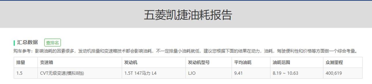 再一个,由于车身自重或者动力系统的匹配问题,五菱凯捷的油耗相当的高,根据小熊油耗的数据显示,五菱凯捷1.5T+CVT车型的平均油耗达到了9.41L/百公里,相当的不经济。