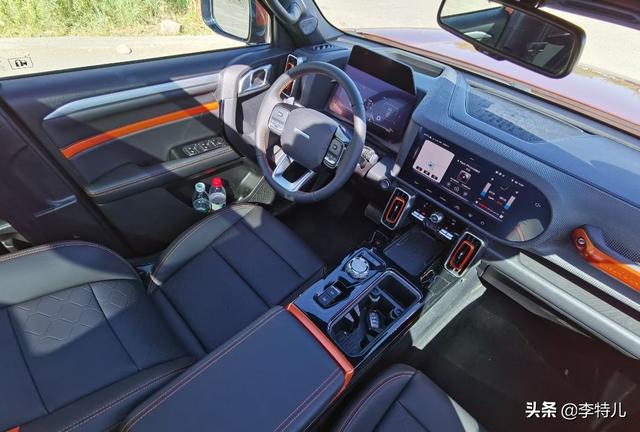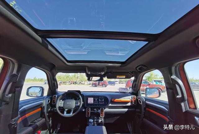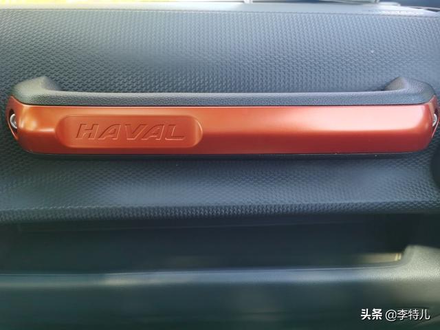 通过无钥匙进入功能进入大狗车内,你会发现新车在内饰方面也有越野风格的延续,比如副驾驶手套箱位置的橙色拉手,车门侧的粗壮有力的拉手、座椅上方侧的车顶扶手,都让这款车看起来更厚重。